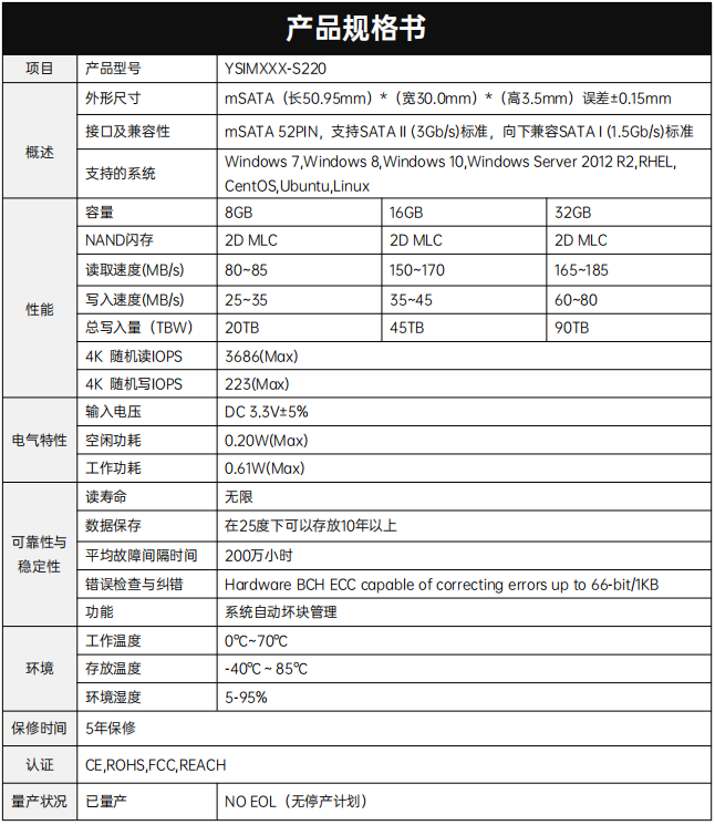 YSIMXXX-S220產品采用4通道SSD控制器和2D MLC NAND Flash,接口尺寸為 mSATA,小巧的尺寸讓該產品可以集成在平臺內。