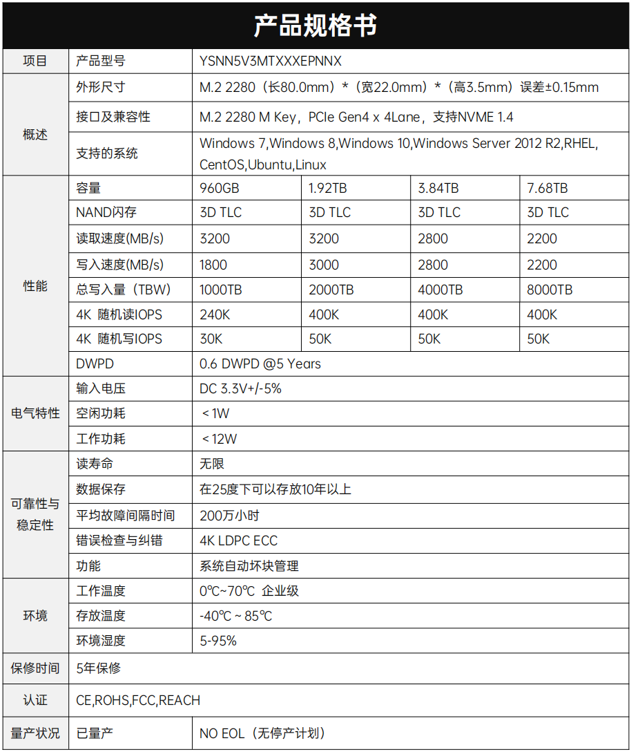 YSNN5V3MTXXXEPNNX是一款基于Marvell科技88SS1321 PCle主控搭配 3DTLC NAND 閃存陣列和DDR4 緩存的M.2 2280 NVMe固態硬盤,PCle Gen4x4的接口標準,支持NVMe1.4協議,采用新一代LDPC 技術確保 NAND 的耐用性,大幅改善固態硬盤數據可靠性和穩定性。